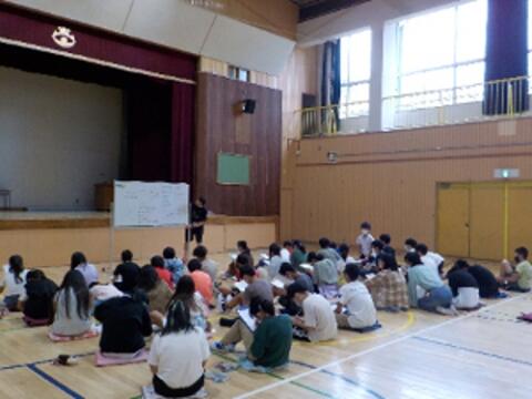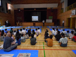 まずはじめに体育館にて生徒会から部活動や委員会活動などの説明をしてもらい、そのあとは中学校のきまりなどについても話をしていただきました。