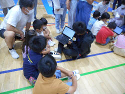 さて、金曜日土曜日とプログラミングの学習を行いました。簡単に説明をしてから取り組みました。(話はもういいから、やらせてオーラがすごくて・・・)学校には教材が10個あるので半分に分かれて学習しました。