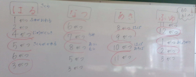 1年生は「はる なつ あき ふゆ」という歌を、(1)四季について学習したり、(2)それぞれの月の特徴を考えたりしながら、みんなで春夏秋冬について考えました。