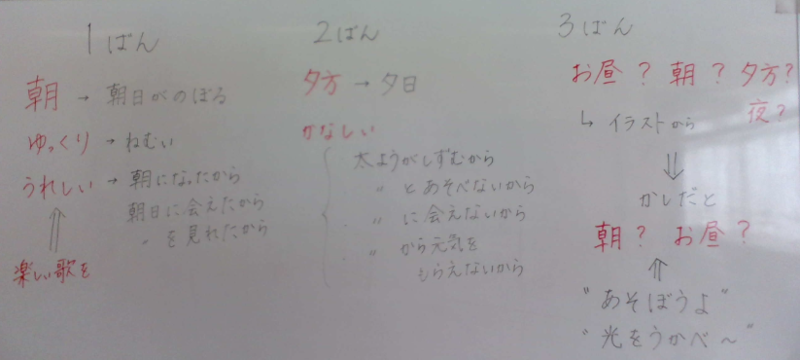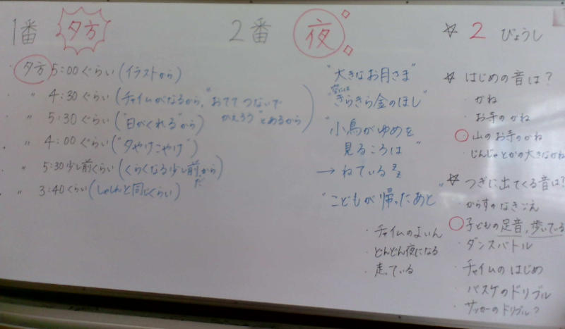 “1日の中でいつ?”、“季節は?”、”どんなところにいるの?”、“誰・何が出てくるの?”といった質問にも、歌詞の内容や自分の考え・思いを【理由付け】しながら答えることができました。「夕やけこやけ」では、実体験(夏と冬とでチャイムが鳴る時間が違うこと、実際に最近見た夕方の様子等)と結びつけて意見を発表する子どもたちも多かったです。