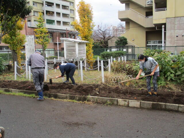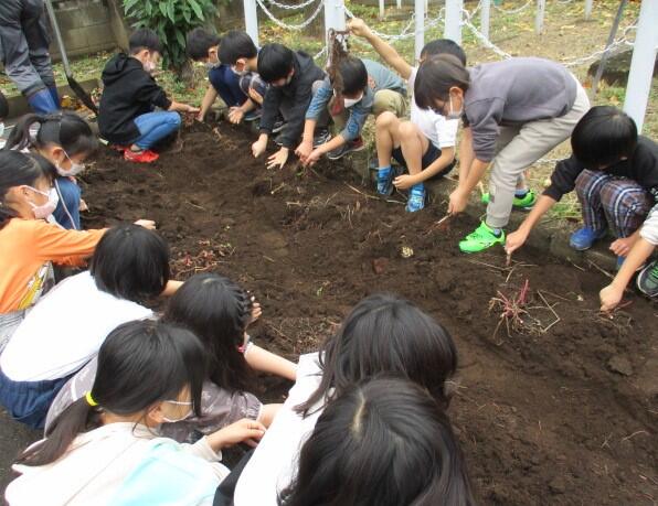子どもたちが芋掘りをしやすいように、先生方も協力して