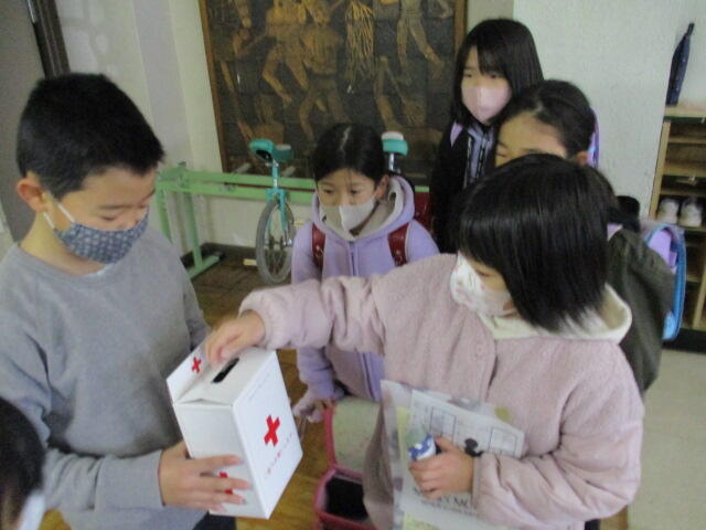 今朝、代表委員が募金箱を持って昇降口に立ち、