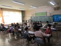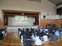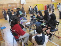 近隣小学校が第五中学校に集まり、予め希望した教科の授業を受ける体験ができる貴重な教育機会です。最初に体育館で、全員で集まった際には、生徒会の皆さんから部活動や中学校生活の様子についての話がありました。