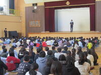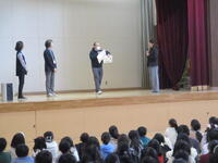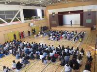 校歌斉唱では、子どもたちの朗々とした声が体育館に響き渡るような、すばらしい歌唱が聞かれました。その後、生活指導主任の先生を中心に、たくさんの先生が参加する演劇(=ロールプレイ)を通して、子どもたちは、冬休みの生活(=SNSルール+お金の使い方)について楽しみながらもしっかりと学ぶことができました。