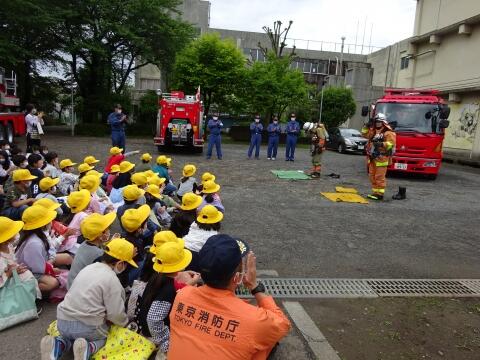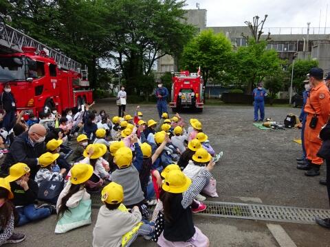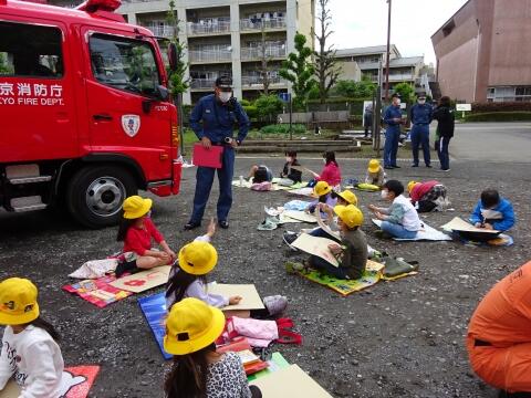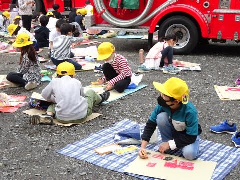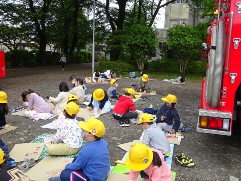 途中、少し雨が降るなど心配な天気でしたがなんとか最後までもちこたえてくれて、子どもたちは予定の時間通りに描くことができました。大きな紙に力いっぱい描いた消防車の絵と、真っ赤になった手、短くなった赤のクレパスを嬉しそうに見せてくれました。最後は消防士のみなさんに