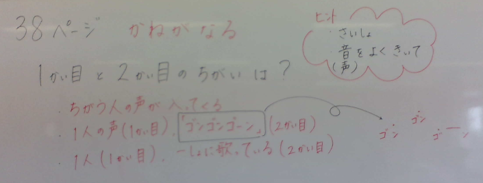 2学期初回から、リズム打ちで遊び歌として親しんできました。生活科で育てた野菜の名前も入れて、楽しく歌っています。リズムに合わせて生き生きと歌っています。○「かねがなる」声の重なり合い、繰り返しのあるフレーズ(言葉)に着目して音楽を聴いたり歌ったりしました。それをもとに以下の「おまつりの音楽」に取り組みました。