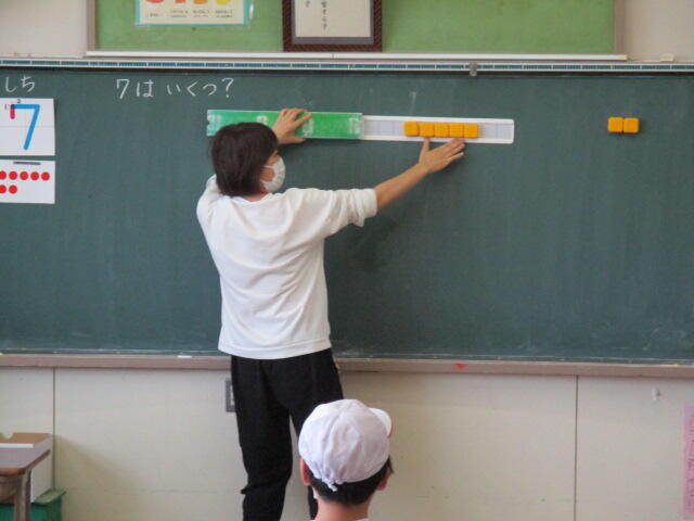 前に出ている子供たちが、一人は黒板に3つのブロックを貼る、もう一人は残りの