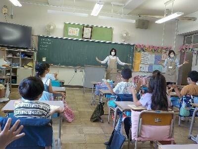 上砂図書館の方が、図書館の使い方について教えに来てくださいました。大きな紙芝居を使って図書館の利用方法を説明して下さいました。また、クイズや大型絵本の読み聞かせ、手遊びうたなど、盛り上がりました。