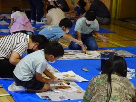 多摩産の木材にやすりをかけてから、ニスを塗りました。6年生のお兄さんお姉さんに教わりながら一生懸命取り組んでいました。