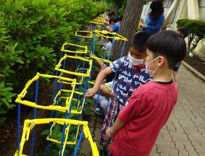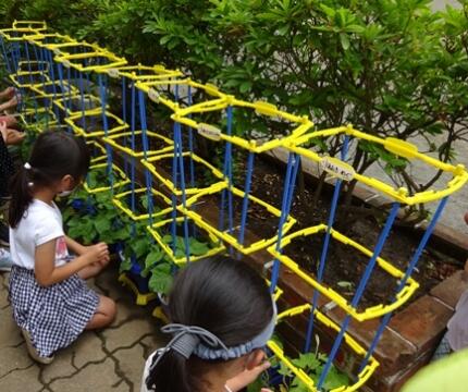 朝顔に晴れた日の朝や、休み時間など進んで水をあげている様子が見られます。順調に育ち、ツルが伸び始めました。友達とからまらないように支柱を立てました。