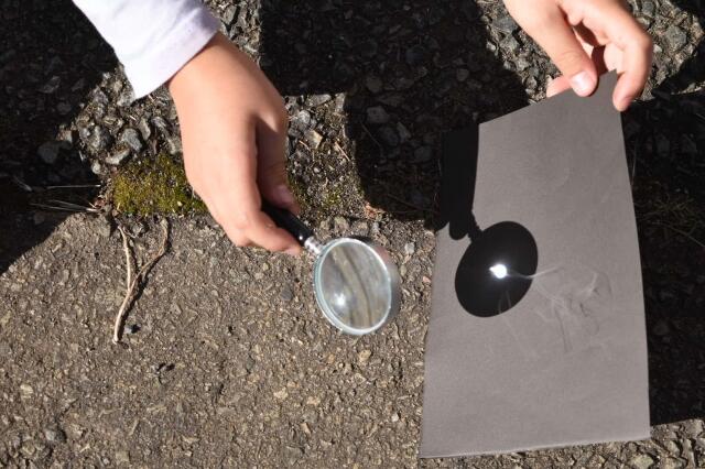 虫眼鏡で太陽の光を集め、紙を燃やしてみました。