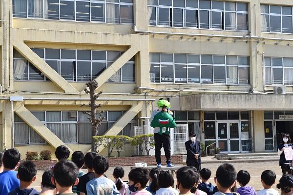 朝会では昨年度50周年をお祝いするマスコット総選挙で全校から選ばれた、緑山(豊)の紹介がありました。