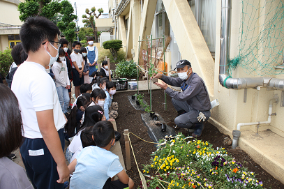 じーじに苗の植え方を教えてもらいました。みんなの大好きな、みんなをいっぱい褒めてくれる宮下じーじです。今年もお世話になります。