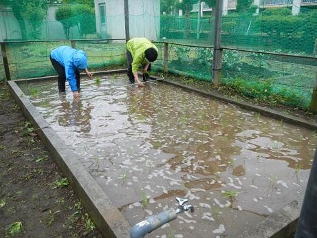今日は、村田先生と一緒に田んぼに稲の苗を植えました。