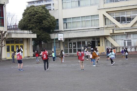 現在、なわとび旬間です。体育委員会がそれぞれの学年に分かれて見本を見せたり、技を教えてあげていたりしています。