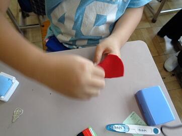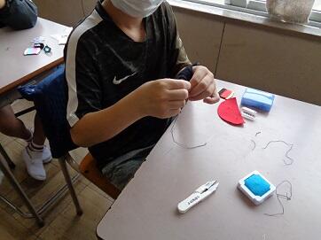 まずは、家庭科。初めての裁縫です。スイカのワッペン作りをしながら、玉どめ・玉結びとなみぬいの練習をしました。最初は、「難しい!」「なかなかできない。」と、苦戦していましたが、繰り返し練習していくうちに、コツを掴んでどんどんスイカの種を増やしていきます。ご家庭に持ち帰りましたので、ぜひほめてあげてください!