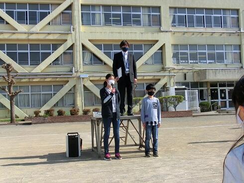 大山小学校では、全校朝会での挨拶を6年生が務めています。まず自分で考えた一言を言ってから、朝の挨拶をします。今週の全校朝会から早速始まりました。ちょうど1年生徒の対面式もあり、全校が揃った初めての全校朝会のことを話題にしていました。これから順番に行ってきます。