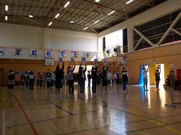 また、6年生からは「おおやましょうがっこう」の頭文字を使ったあいうえお作文で1年生にメッセージを送りました。