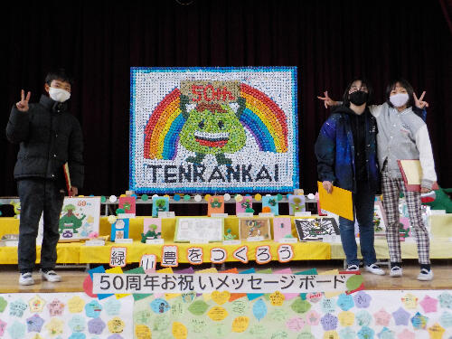 展覧会実行委員が作ったペットボトルキャップの緑山(豊)の前で