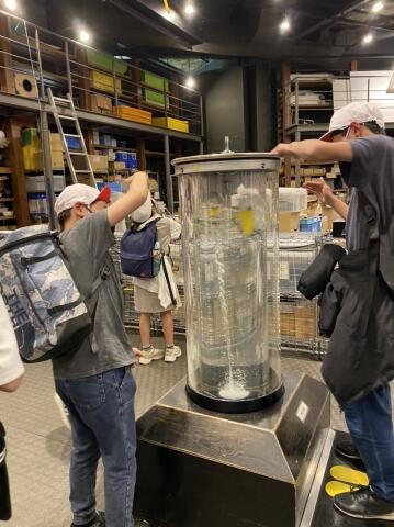 勢いよく上のふたを回すと水中に渦巻きができる機械があったり…