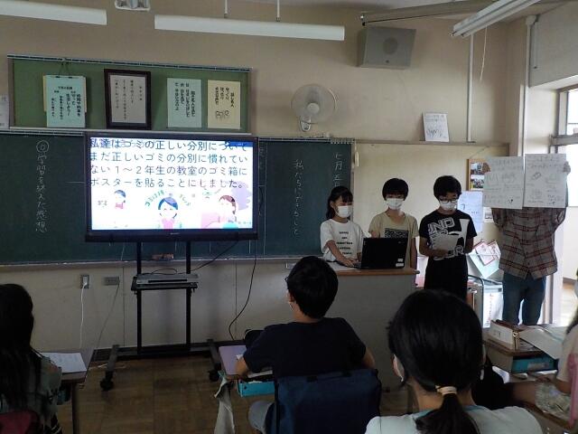 イラストやポスターを用いて、全員で前に出て堂々と発表することができていて、聞いている子も”この提案はいいね!”という意見も伝えてくれるいい時間となりました。実際の提案内容に即して、これからも活動を行う予定です。何事も一生懸命取り組む姿に成長を感じました。