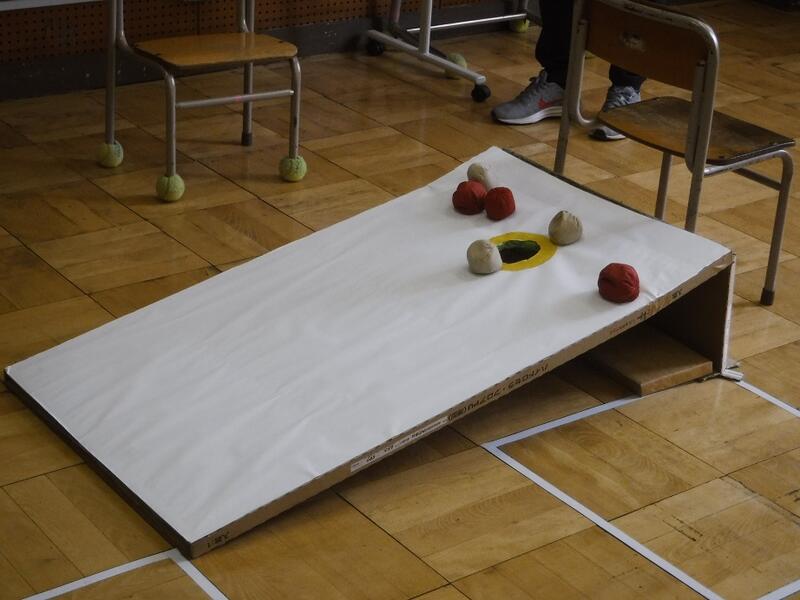 アメリカ発祥のスポーツ「コーンホール」をアレンジして、グループの授業で行いました。2チームに分かれて交互に玉(紅白玉)を投げます。台の上に乗ったら1点、穴のふちに掛かったら2点、穴に入ったら3点です。穴を狙って慎重に投げます。力加減とチームワークが大切です。