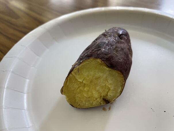 本日、2年生はサツマイモの収穫も行いました。芋は量的に持ち帰り分はなく、お世話になった方々へのプレゼントになるようです。他所へお渡しするものなので、チェックも兼ねて掘る時に折れてしまった芋を焼いてみました。すると廊下を歩く子供たちが、「焼き芋のにおいがする。」「先生たちみたらし団子食べてるんじゃない。」と言っていました。とても甘く良い香りが一階の廊下に漂いました。皮に蜜があふれ、とてもおいしそうです。