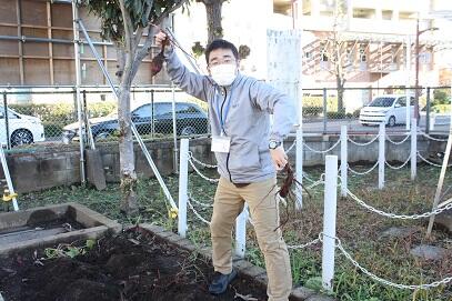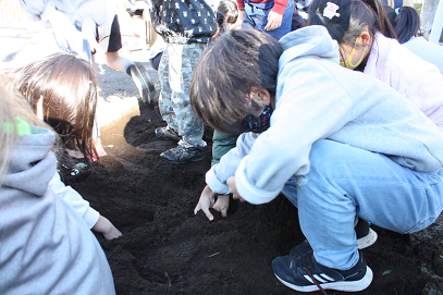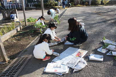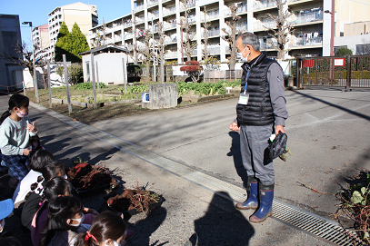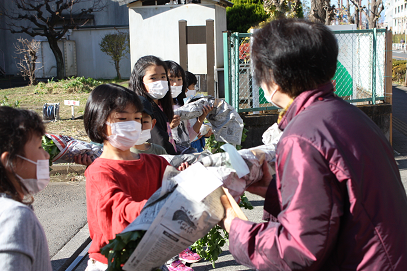 寒い中の農作業。作ってくれる人に感謝するとともに、3年生になってからの社会科の勉強につながっていきます。