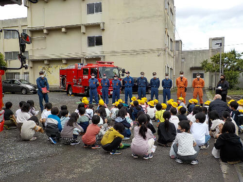まずは、消防士さんのお話を聞いています。火事のための出動の際には、50秒で消防服に着替えるそうです。