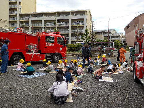 消防士さんたちも、みんなの絵を見ながら「大きくていいね」「しっかり色がぬれているね」など、おほめの言葉をかけてくださいました。
