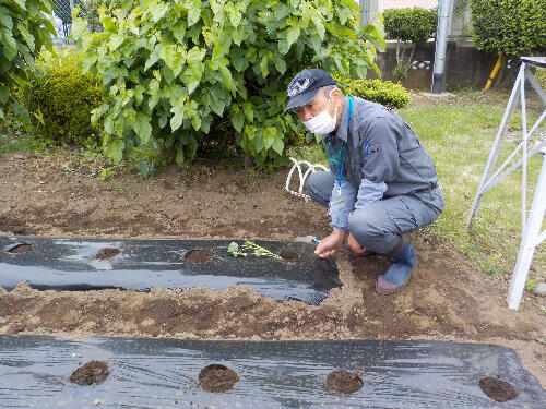 先日、指導してくださる宮下さんに野菜の苗の植え方を教えていただきながら、「きゅうり」「なす」「ミニトマト」「さつまいも」の苗を植えました。