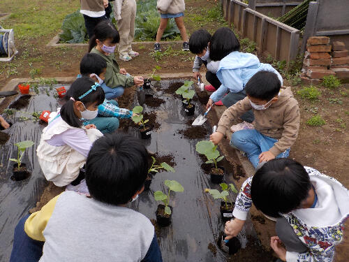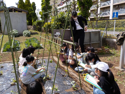 次の日には、自分の好きな苗を観察しました。これからその苗の成長を記録していきます。できた野菜は一人1個はお家に持っていき、その他に採れた野菜は地域の方々におすそわけする予定です。