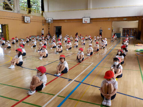 ☆「ダンシング玉入れ」です。腰をふりふりしながらの踊りはとても可愛かったですよね。その踊りを見ているだけでも楽しくなりますね。練習同様、紅組の勝利でしたが、勝敗に関わらず子どもたちは楽しく取り組んでいました。