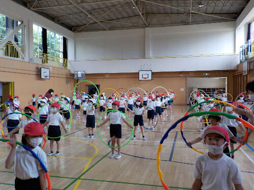 今年の1・2年生の表現は、フラフープを使ってのダンスです。