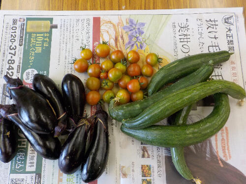 初出荷の野菜です。なすとミニトマトがたくさん採れました。
