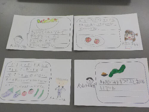 昨日、第1回の野菜の出荷を行いました。出荷するまでには、お知らせのポスターをかき、掲示板に貼りにも行きました。美味しく食べてもらうために、おすすめの食べ方のメッセージカードも作りました。地域の方々が喜んでくれると嬉しいですね。