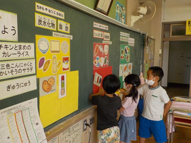 給食に使われている食品を、黄色・赤・緑の栄養素別に分けてみました。