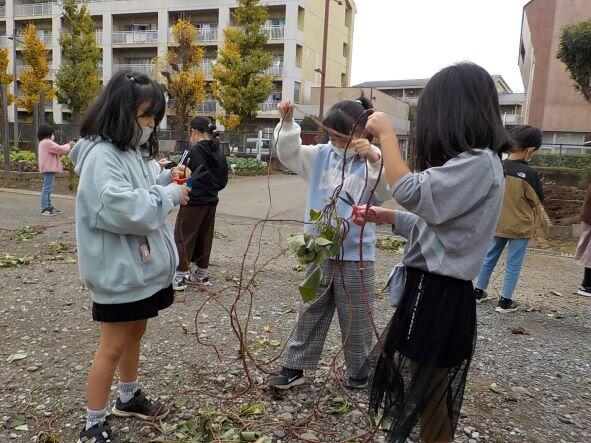後日、サツマイモのつるを使ってリース作りに挑戦しました。