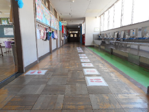分散登校中は、水道を一つ置きに使って間隔を開けます。(足あと一つとばし)