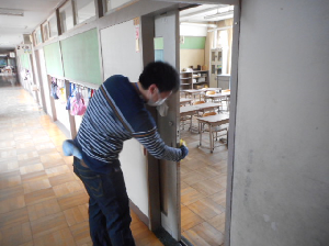 毎日、教職員で校舎を消毒します。消毒範囲を明確にするため、