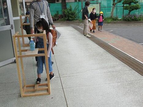 校舎に入る前に教員が検温をしてきているか確認をし、ひとりずつアルコール除菌を行っています。(手で押さないでよいように足踏み式の装置を用務主事さんが作成してくれました。)