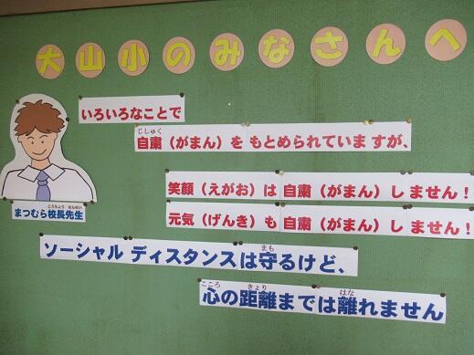ソーシャル ディスタンスという言葉が定着し、他者と距離を置くことを求められている現状ですが、そんな時だからこそ、人と人との心の距離は離れないようにしましょうと呼びかけています。また、いろいろなことで自粛が求められていますが、大山小では笑顔や元気は自粛しないで、子どもたちに「やっぱり学校は楽しい」と思わせてあげられるようにがんばります!