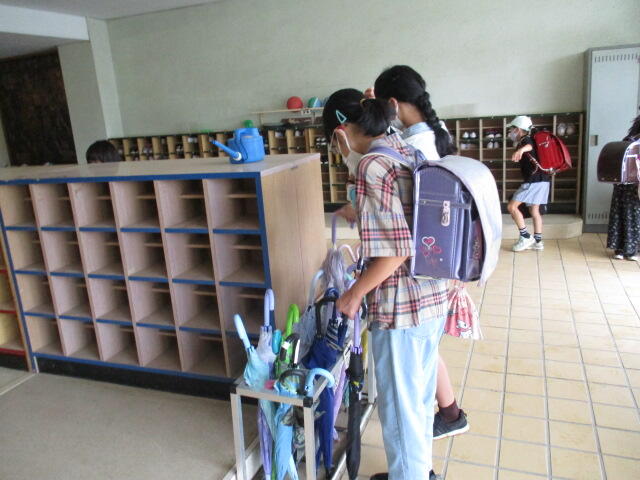 そこで、6年生が「きちんと傘を畳んで、傘立てに置くこと」