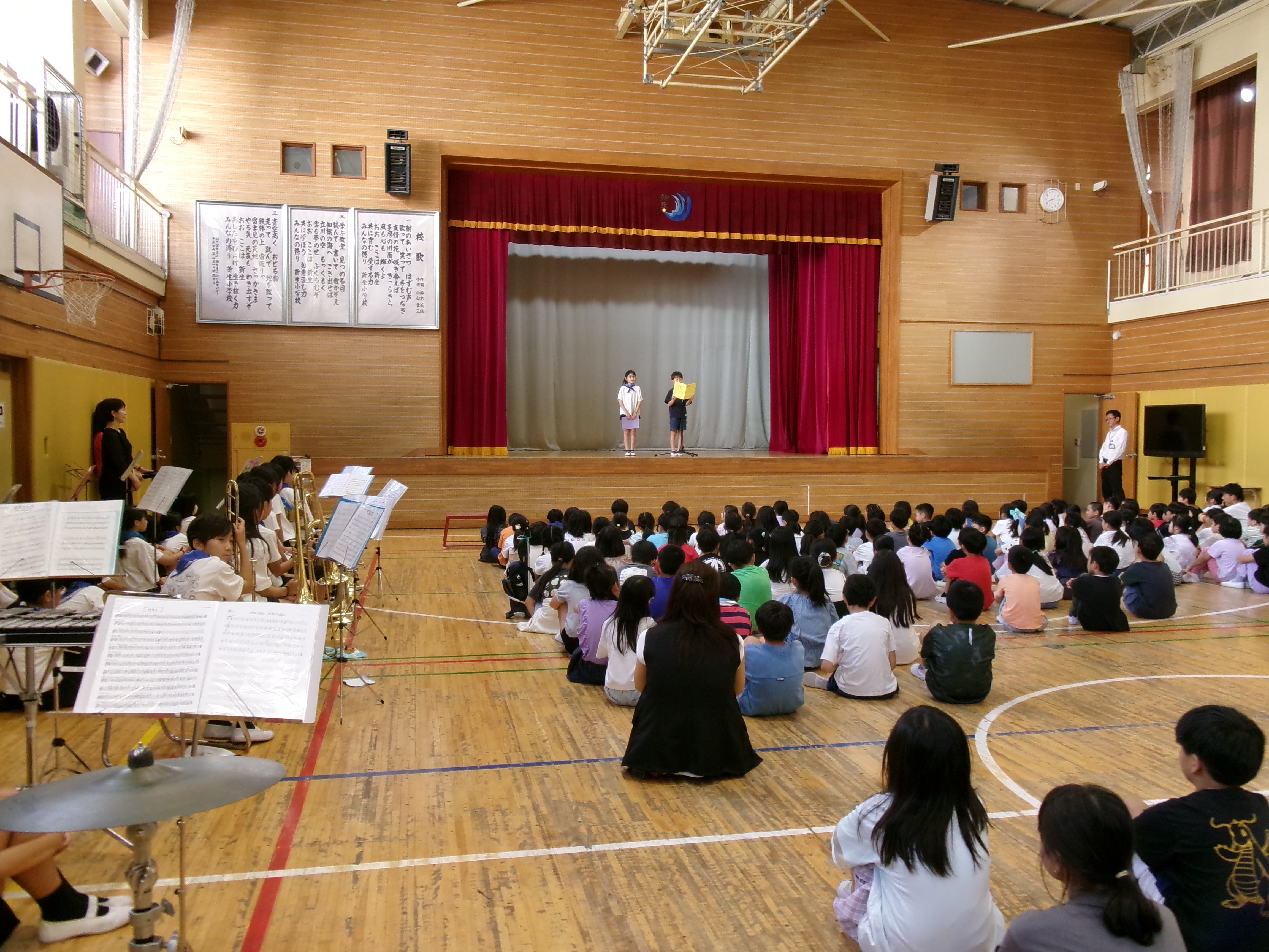 新生小学校では1学期終業式を迎えました。4年生の代表者が、楽しみながら頑張ったことなど成長の様子が感じられる発表をしたり、新生バンドの演奏に合わせて校歌を歌ったりしました。また、終業式終了後には代表委員会の企画で踊っていた「エビカニクス」を全校で踊り、楽しみました。100_1300.JP