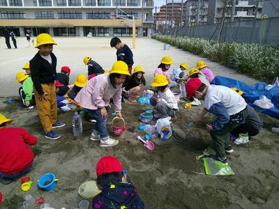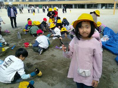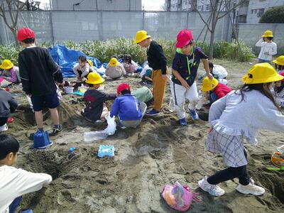1年生の最後の図工は、砂場での造形遊び