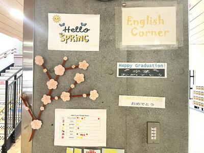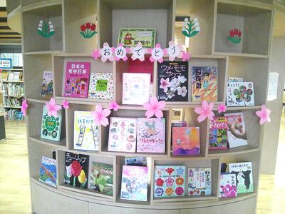 図書室のコーナーも、春らしい掲示。今更