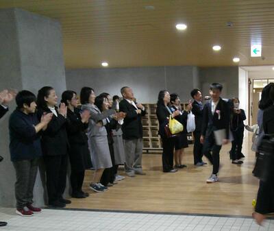拍手と「おめでとうー!」の声の中、4階