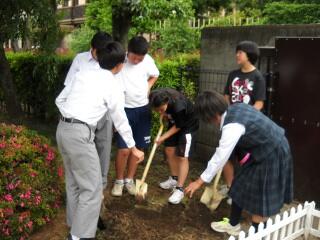 | 6月9日(火) 昨日、コスモスの種まきを行い、水やりをしました。 これからの成長が楽しみです! 25名のボランティアの生徒で水やりやコスモスの世話をしていきます。 | ||