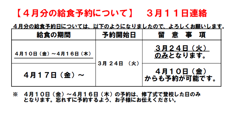 ○4月の給食予約ができます。ランチカードを忘れずに。