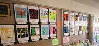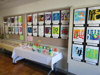 2階の渡り廊下には美術の授業で取り組んだ作品が展示されていました。